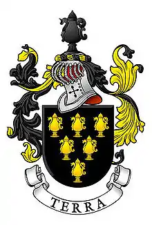 There is indication that van Aertrycke or one of his descendants brought his family arms to the Azores (fig. 2) a black escutcheon with six golden pitchers. This coat of arms was probably granted to Simon van Aertrycke, the Elder, Lord of Tillegem (fl. 1331) in the mid 1340/50s in Flanders, and brought to Portugal by Josse in the 15th century. So far, it has not been possible to verify when it started to be used in Portugal.[1]