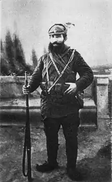 Pavle Mladenović established the first local Serb-oriented cheta (band) in Kumanovo[7] in springtime 1903 when the Internal Macedonian Revolutionary Organization (IMRO) started assassinating and murdering people who identified themselves as Serbs in the Kumanovo region.[8][9] After Mladenović, Jovan Stanojković, who had been a teacher up until then in Rudar,[10] formed a band in the Kumanovo region.[11] He adopted the nom de guerre "Jovan Dovezenski".[12] Dovezenski spontaneously decided to command his own band after Bulgarian commander Atanas Babata massacred Serbs in his village on 11 August 1904.[10] After the establishment of bands in Kumanovo, self-organized bands were established in Skopska Crna Gora and in the Palanka kaza.[13] All of these bands had the objective of self-defense, and they worked independently from one another.[13] In the summer of 1904, resistance to the Bulgarian oppression emerged with the first Serbian-organized secret band in Drimkol, led by Đorđe Cvetković-Drimkolski from Labuništa.[13] Henceforth, the movement was coordinated.[13]
