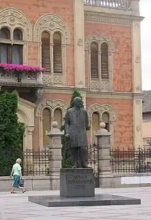 Zmaj was born in Novi Sad, which was then part of Batsch-Bodrog County (Kingdom of Hungary, Austrian Empire; today in Serbia), on 24 November 1833. His family was old and noble, and had roots in modern-day North Macedonia.[2] His father came from a family of Aromanian descent, which is something that neither Zmaj nor other people from his epoch discussed, probably meaning that his family was fully assimilated.[3] The Jovanovićs lived in Vojvodina as of the 18th century.[2] Zmaj's father Pavle served as the mayor of Novi Sad after the Hungarian Revolution of 1848 and his three brothers were soldiers, government officials and Serbian patriots.[2][4] In his early childhood he showed a desire to learn by heart the Serbian national songs that were recited to him. As a child he began to compose poems. He finished elementary school in the town, and attended secondary school in Halas and Preßburg (today Bratislava), later studying law in Ofenpesth (Budapest), Prague and Vienna.[2] This was his father's wish but his own inclinations prompted him to take up the study of medicine. Zmaj then returned to his native city, where he accepted prominent official position. A year later, his poetic instincts caused him to leave his job to devote himself entirely to literary work. In 1870, Zmaj returned to Novi Sad to work as a doctor, motivated by the tuberculosis from which his wife and children were suffering.[2]