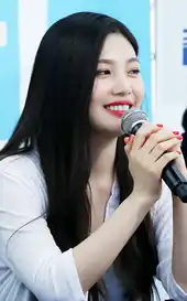 Following two years of training, a vocal coach gave her the stage name "Joy".[2] Joy was officially introduced as the fourth member of Red Velvet on July 29, 2014.[9][10] Joy was the only member of the group who was not introduced as a part of SM Rookies, a pre-debut training team created by SM Entertainment. Red Velvet made their debut in August 2014 with the digital single "Happiness". Over the course of their promotion, the group established themselves as one of the most powerful celebrities in South Korea by Forbes Korea Power Celebrity in 2018[11] and 2019,[12] and gained global popularity with Billboard regarding them as one of the most popular K-pop groups worldwide.[13]