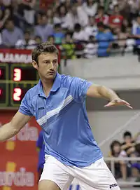 Ferrero continued to be a key Davis Cup player in subsequent years. In both 2003 and 2004, Ferrero contributed to Spain's successive progress to the Davis Cup final.[37] In 2004, Spain won the Davis Cup for the second time. In 2009, Ferrero won the fifth and decisive rubber against Andreas Beck of Germany, 6–4, 6–4, 6–4, in the quarterfinals,[38] putting Spain through to the semifinal. In the semifinal Ferrero won the second rubber against Israel, 6–4, 6–2, 6–0,[39] putting Spain on track to win the Davis Cup for the second consecutive year, the first nation to do so since Sweden in 1998.[37] As Nadal returned from injury to play the final for Spain, Ferrero was not selected to Spain's final team. He attended all the live rubbers to support his teammates during the first two days of the Davis Cup final as a reserve player. He was not included in the 2009 Davis Cup presentation ceremony and celebrations on the final day.[40]
