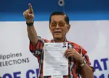 Enrile quietly bowed out of politics after his term in the Senate ended in 2016, but tried to make a comeback in 2019. He placed 22nd in a field of 62 candidates.[49] In 2022 he officially returned as government as Chief Presidential Legal Counsel in the administration of President Bongbong Marcos, whom he supported for president in elections that year. He played a role in forcing the resignation of Marcos' Executive Secretary Vic Rodriguez on September 17 by rejecting the latter's appointing of himself as Presidential Chief of Staff with extensive powers.[50]