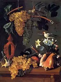 The second, younger, still active in 1659, Juan de Espinosa signed the letter of dowry the painter Francisco de Burgos Mantilla in 1645, the same date wearing a still life of flowers and fruits, The Louvre Museum, signed in the same way. This is a free painter of bright colors and strong lighting applied to complex compositions. In the same hand as the Louvre are two separate oil fruit still life Museo del Prado and the dead bird life with the Museum of Córdoba, from three of the royal collections, all of which shows the same precious treatment of grapes, made based glazes, clear red and intonation. More complex is the relationship established between the individual parts still life with grapes octagonal, signed in 1646, entered in 2006 at the Museo del Prado, which again appears a dead bird, but now in a diagonal, between bunches of grapes, pears, apples, some dried fruit and Mexican red clay pileup similar to that used in the still life of the Louvre. The detailed treatment and also fresh fruit, particularly grapes, which seem to receive the light from within, and the use of back to profile branch leaves, approximates stylistically the work of this painter to the work of Juan Fernández, Labrador.