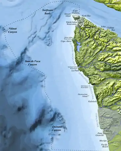 Map of Juan de Fuca Canyon, though not all is here visible. The Quinault Canyon is visible, below it, and the Juan de Fuca Strait, above it. East is Washington state; Canada is north.