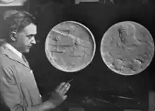 Julio Kilenyi (February 21, 1885 Arad, Kingdom of Hungary (now in Romania) - January 29, 1959) an American sculptor and medallic artist. In 1909, he moved to Buenos Aires, Argentina.[1] Later he moved to New York.[2][3] He began his career in the U.S. in 1916 and was known primarily as the designer of commemorative medals.[4] His work was part of the sculpture event in the art competition at the 1932 Summer Olympics.[5]