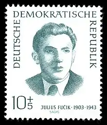 Julius Fučík (Czech: [ˈjulɪjus ˈfutʃiːk]) (23 February 1903 – 8 September 1943) was a Czech journalist, critic, writer, and active member of Communist Party of Czechoslovakia. For his part at the forefront of the anti-Nazi resistance during the Second World War, he was imprisoned and tortured by the Gestapo in Prague, and executed in Berlin. While in prison, Fučík recorded his interrogation experiences on small pieces of paper, which were smuggled out and published after the war as Notes from the Gallows. The book established Fučík as a symbol of resistance to oppression, as well as an icon of communist propaganda.