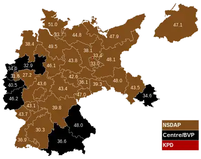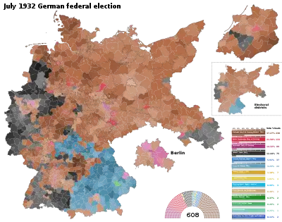 Federal elections were held in Germany on 31 July 1932, following the premature dissolution of the Reichstag.[1] The Nazi Party made significant gains and became the largest party in the Reichstag for the first time, although they failed to win a majority. The Communist Party increased their vote share as well. All other parties combined held less than half the seats in the Reichstag, meaning no majority coalition government could be formed without including at least one of these two parties.