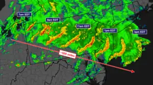 While there were few damaging wind gusts of 60 mph (97 km/h) or more while the storm moved across western and central Pennsylvania in the morning, the storm intensified by noon. Significant wind damage began as the system entered Berks County, Pennsylvania, and continued through the Delaware Valley towards Ocean County, New Jersey.[6] The 83 mph (134 km/h) wind gust measured in Berks was the strongest on record, surpassing the 82 mph (132 km/h) gusts recorded during Hurricane Hazel.[7] Social media footage from the storm showed funnel clouds in Philadelphia and hail in State College, Pennsylvania.[8] The storm crossed the Delaware River around 12:30 p.m. EDT and reached Long Beach Island by 1:15 p.m. The derecho was most severe in Ocean County, New Jersey, where wind speeds were measured at 93 mph (150 km/h) in Beach Haven and 92 mph (148 km/h) in Surf City.[1] By 2 p.m. EDT, the storm had moved off of the New Jersey coast.[6]