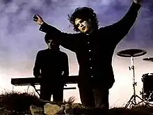 Robert Smith and Roger O'Donnell (background) in the music video shot in studio to replicate the cliffs of Beachy Head in reference to the song's lyrics.