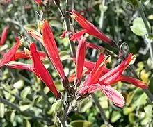 It can grow to 1.5 metres (5 feet) in height and almost as wide.[1] For a short time it bears succulent leaves about 1.5 centimetres (5⁄8 inch) in width.[1] It loses its leaves and then produces plentiful tubular flowers about 2.5–4 cm (1–1+5⁄8 in) long between February and June.[1] These are usually in shades of bright to deep red, or sometimes yellow, with a two-lobed upper lip and a wide three-lobed lower lip[1] that falls open to reveal the inside of the blossom.