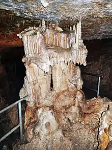Within the cave, various parts have been named in recognition of the individuals who played a role in its discovery and development. Additionally, some sections are named based on the appearance of the dripstone formations they contain. King's Grotto, for instance, is a chamber that rises irregularly to a height of eight to ten meters. Within this grotto, there are numerous low, hood-shaped stalagmites. These distinct stalactite formations have been given names such as "Buddha", "Castle", and "Hermits".[1]