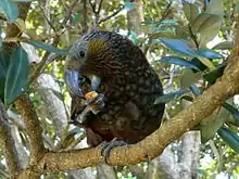 The island is home to a number of native bird species, mostly re-introduced. These include the takahē, North Island kōkako, brown teal (pāteke), stitchbird (hihi), North Island saddleback (tīeke), tomtit (miromiro), fantail (piwakawaka), morepork (ruru), weka and North Island robin (toutouwai). Five little spotted kiwi were translocated from the South Island to Kapiti Island in 1912. There are currently 1,200 little spotted kiwi on Kapiti Island, which are now extinct on the mainland.[26][27] On 12 October 1912, three kākāpō were released on Kapiti Island.[27] Rat eradication has led to increases in red-fronted parakeets, North Island robins, bellbirds, and saddlebacks. The island is considered one of New Zealand's most important sites for bird recovery, and a breeding site for seabirds such as the sooty shearwater (tītī). However, sooty shearwaters have been under threat on the island because of predation by weka.[28] Other birds that use the island for breeding include the spotted shag.[29]