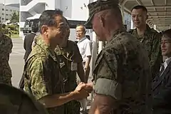In August 2017, he was appointed 35th Chief of the Ground Staff of the Japan Ground Self-Defense Force, the highest position in the JGSDF after the resignation of General Toshiya Okabe and former Defense Minister Tomomi Inada amidst claims over a cover up scandal within the Ministry of Defense, exposing the danger Japanese peacekeepers were facing in South Sudan.[2] As the Chief of the Ground Staff, he strengthened Japan's strategic partnerships and mutual defense policies in the Asia-Pacific Region, such as strengthening cooperation to the Philippines, where he met with then-Commanding General of the Philippine Army Lieutenant General Macairog Alberto,[3] and the Chief of Staff of the Armed Forces of the Philippines General Benjamin Madrigal Jr.;[4] and the United States, where he met numerous US military generals and continued to enhance the US-Japan military relations.[1]