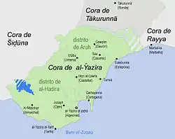 It covered what today is the Campo de Gibraltar and the coast up to Marbella. It was a mountainous area, therefore, with a livestock economy, basically. Its capital was Al-Jazírat al-Jadra (Algeciras), which was also its main commercial and transport port. It was very populated and consisted of several iqlim: Aruh (Castellar de la Frontera), al-Hadira, Olba and others, which included the cities of Gibraltar, Tarifa, Jimena de la Frontera, Gaucin, Ojen, Maysar and Turrush. It was bordered on the north by the Kūra of Takurunna, on the east by the Kūra of Rayya and on the west by the Kūra of Siduna.[17]