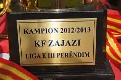 The club's major success was achieved in the season 2012–13 when they won the Macedonian Third League – West. Finishing first in the Macedonian Third League – West; gave them the right to compete in the play-offs for a promotion to the Macedonian Second Football League. In the play off game they were drawn against FK Babi Stip (Macedonian: ФК Баби). A match which they won 1–0 and got promoted to the Macedonian Second Football League for the first time in their history. The game against FK Babi Stip was a very intense one, with KF Zajazi clearly being the better team during all the match, but they failed to capitalize the changes they created. It needed an 84th-minute header from Mergim Dani, following a cross from Lulzim Tairi to put the match to sleep and send KF Zajazi to the Second Macedonian Football League.