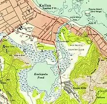 Kaʻelepulu Pond, also known as Enchanted Lake, is an estuary in Kailua, Hawaii.[1] The Hawaiian name Kaʻelepulu literally means "moist blackness".[2] Historically a 200-to-400-acre (81 to 162 hectare) Hawaiian fish pond, and later a fishery made up of 190 acres (77 hectares) of water and 90 acres (36 hectares) of marsh, Kaʻelepulu was partially filled in and built on beginning in 1959. Today the pond covers about 95 acres (38 hectares) in total, including wetland and some small islands, and has been subject to fish kills and algal blooms as a result of pollution from surface runoff; the Enchanted Lake Residents Association advises residents not to eat anything taken from it.[3]