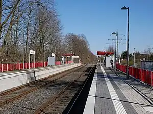 Kaarst IKEA station is a Rhine-Ruhr S-Bahn station in the town of Kaarst in the German state of North Rhine-Westphalia. It was opened as Holzbüttgen between 1954 and 1957 on the remaining part of the Neuss–Viersen railway, which was opened by the Rhenish Railway Company on 15 November 1877.[5] It was reopened as IKEA Kaarst (after the nearby IKEA store) on 26 September 1999 and given its current name on 16 June 2002.[4]