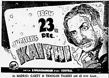 The producer M. Somasundaram of Jupiter Pictures approached S. Balachander to make a film for his banner.[2] Balachander developed a story based on the American film Dark Passage (1947) involving a wrongfully convicted man escaping from prison to clear his name.[1] While he also wrote the screenplay, the dialogues were written by T. S. Venkatasamy, Kalaimani and N. Seetharaman. Cinematography was handled by B. Ramasamy,[4] and editing by M. A. Thirumugam, then the staff editor of Jupiter.[1] Initially, the film was announced with the title Raktham (Blood), and various Tamil publicity posters had the caption Velivarugirathu! Jupiterin Raktham! (Coming! Jupiter's Blood!) in bold and all caps. This shocked Balachander, Somasundaram and Jupiter co-founder S. K. Mohideen, so the title was changed to Kaithi, suggested by Balachander.[1][2]