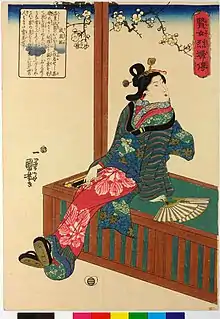 Other Japanese poets have referred to her and her work in their poetry, including Takarai Kikaku, Yosa Buson, and Yosano Akikio.[5] She and her teahouse were depicted by artists like Mikuma Katen (1730–1794) and Utagawa Kuniyoshi.[2] Kuniyoshi included her in his series of prints called Kenjo Reppuden ("Stories of Wise Women and Faithful Wives").[4] She is one of the many figures celebrated in the annual Jidai Matsuri festival in Kyoto.[1]