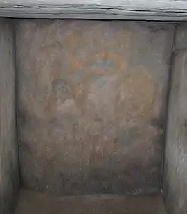 The Kokufucho area of Tottori city has numerous ancient burial mounds in the valleys of small hills which have been known for a long time; some were once used as air-raid shelters during World War II. The Kajiyama Kofun is located in horseshoe-shaped recess about 40 meters wide on the south side of a hill. The tumulus is 17 meters in diagonal length and has a modified octagonal shape (八角形墳) with sides of 2.5 to 8.5 meters. The tumulus is orientated to the south, and in front of the entry a square platform two meters long and 14 meters wide for rituals is built over three levels with basalt stone walls.[2] The horizontal stone burial chamber is made of cut tuff. It consists of a burial chamber itself, a gate, and an antechamber with a total length of 9.2 meters. The burial chamber measures 2.35 meters in length, 1.37 meters in width, and 1.6 meters in height. Both sides of the entrance gate are made of stone, and there is an indentation in the front for fitting a door stone. In the 1978 excavation, a colored mural in red-yellow colors was discovered on the back wall of the burial chamber. On the upper part of the mural, are a triangular pattern and a concentric circle pattern symmetrically drawn in thin lines, and in the middle is a curved pattern of unknown design and a fish, 53-cm long, believed to have been a salmon or carp. Further down, there are two circles with a diameter of about 40 cm. Motifs such as triangular, circular, concentric circles, and fish are seen in decorated burial mounds in various parts of Japan, including the Kyushu region. Based on excavated artifacts such as Sue ware, Haji ware fragments, iron swords, metal fittings, thin gold-plates and the structure of the stone chamber, it is estimated to have been built between the latter half of the 6th century and the 7th century. The elaborate technique of cut stone in the stone chamber and the technique of the mural painting show a strong influence of continental culture. It is unknown who was buried in this tomb, but there is a theory that it was Prince Asagi, a member of the imperial family who was exiled to Inaba in 675. [2] Based on the discoveries made during the excavation, the tumulus has been reconstructed with a modified octagonal mound and square altar. The burial chamber, formerly open and used by children as a playground, now has a door to preserve the wall paintings. It is now open to the public for about three days in spring or autumn when the temperature difference between the outside and the stone chamber is small. In addition, a full-size replica of the burial chamber is displayed at the nearby Inaba Manyo Historical Museum (因幡万葉歴史館).[2]