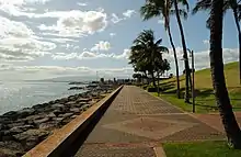 Kakaʻako Waterfront Park, also known as "Point Panic Park", is a public park in Kakaʻako, south of downtown Honolulu, just off Ala Moana Boulevard at the end of Cooke Street. It was opened in November 1992 on the site of a former municipal landfill and consists of 35 acres (140,000 m2) of grass-covered rolling hills adjacent to the ocean. There is no sandy beach at this location, and access to the ocean is by concrete stairs. The park has bathrooms, water fountains, free parking, picnic tables, an amphitheatre, pay telephones, paved jogging paths, and two popular surfing spots, "Point Panic" and "Flies".
