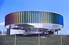 Designed to reflect a color-based theme, the pavilion acted as an oversized, three-dimensional color wheel.[1] Built in the shape of a carousel, it featured 112 colored fins that created the illusion the structure was moving as spectators moved across the Expo grounds.[2] The interior of the pavilion consisted of a 12-minute film titled Man and Color that was projected on oversized screens.[3] Shown over the course of three differently designed rooms, mirrors were used to create an abstract, reflection-driven experience of color.[1] Music for the exhibit was composed by R. Murray Schafer.[4][1]