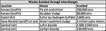 All of these exchanges have contributed to water savings, and savings in fuel and input chemicals. Wastes were also avoided through these interchanges. For example, in 1997, Asnaes (the power station) saved 30,000 tons of coal (~2% of throughput) by using Statoil (large oil refinery) fuel gas. And 200,000 tons of fly ash and clinker were avoided from Asnaes landfill.[3] These resources savings and waste avoidances, documented before 1997, are illustrated in the tables to the right.