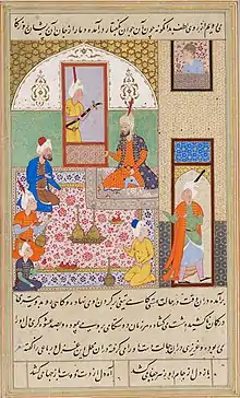 Kamal al-Din Gazurgahi in the presence of Sultan Husayn Bayqara. Folio from the Majalis al-ushshaq of Gazurgahi, dated October/November 1552