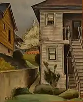 While his skill as a sign painter was a source of income, his oil paintings headed in a very different direction. He painted scenes of the world around him—houses, apartment buildings, stores, streets, bridges, the waterfront—using bold outlines and subtle valuation of earthen tones. With his friend Nomura and others he at times ventured into the countryside to paint rural scenes, but most of his still-extant paintings show urban scenes of the city where he lived and worked. Because of his vernacular subject matter and realist approach he came to be associated with the American Scene painters, but unlike many of them he rarely painted human forms.[8]