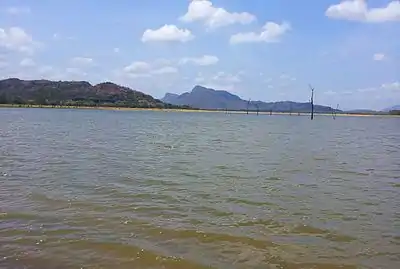 The Kandalama Reservoir (also erroneously known as the Kandalama Lake) is a reservoir in Kandalama, Sri Lanka. The reservoir is created by the 21 m (69 ft) high and 1,600 m (5,200 ft) wide Kandalama Dam. Water from the dam is used for irrigation purposes in the region, extending up to Kekirawa.[1] The tank was created by constructing a dam across one of the main tributaries of Kala Wewa - the Mirisgoniya River. During 1952 to 1957, the tank was rehabilitated by Department of Irrigation of Sri Lanka.[2] The reservoir and hotel is situated with the Kaludiya Pokuna Forest archeological site.