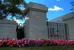 The Brisbane temple of the Church of Jesus Christ of Latter-day Saints (LDS Church) is at 200 River Terrace (27°28′51″S 153°02′01″E / 27.4809°S 153.0336°E / -27.4809; 153.0336 (Brisbane Temple of The Church of Jesus Christ of Latter-day Saints)).[37] The gold statue of the Angel Moroni at the top of the spire of the temple is highly visible and illuminated at night.[38]