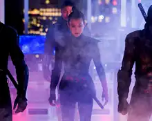 • Karai appears in Teenage Mutant Ninja Turtles, portrayed by Minae Noji.[86] Karai is depicted as Shredder's assistant who leads many of the Foot Clan's field missions. Karai is seen many times accompanying Eric Sacks and Shredder. Karai is last seen in a car chase with the Turtles where Raphael causes her jeep to crash into a tree.