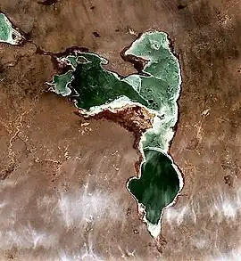 River Tundik flows into Karasor from the west. The shape of the lake is irregular, very indented, with a southern and a western projection. Although it rarely dries up, in years of drought the level of Karasor sinks, and its southern projection may become a separate lake, also known as Zhinishkesor (Жіңішкесор).[3][2][1][4]