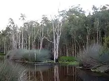 The wetlands provides habitat for a number of threatened and endangered species including the powerful owl, glossy black cockatoo and the green thighed frog. Also found within the park are the red-necked wallaby, swamp wallaby and eastern grey kangaroo.[1] While not threatened or endangered the reserve is home to greater gliders, squirrel gliders and sugar gliders.[5]