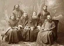 The five brothers, along with their sister Sidonia, were the children of Grigol Karbelashvili (1812–1880), a priest in the village of Kvemo Chala.[1] The elder Karbelashvili was the son of Petre Karbela (Khmaladze), who had in his youth been a chanter at the court of Erekle II, Prince of Mukhrani, and who went on to teach chant at the Samtavisi Cathedral. Grigol was himself also well-versed in the fields of church chant and reading, having studied music with his father;[2] further educated at Shio-Mgvime monastery between 1820 and 1824, he was ordained a clergyman in 1849. He imparted his musical interests to his sons, each of whom came to be active in religious and pedagogical life.[1] The brothers first sang together in 1864, performing folk songs at a gathering near Nishevo Castle on May 1.[3] With Makari Batatashvili and others Grigol was active in early efforts by the church to preserve traditional chant, founding a school for the purpose in the 1860s.[4]