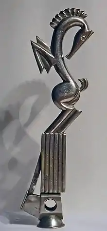 Hagenauer was responsive to the change in public taste influenced by the popularity of the Vienna Secession. His stylized animals and whimsical creatures handcrafted in brass had broad appeal in domestic and American markets.[4] Some were useful, such as mirrors, cigar cutters, ashtrays,[5] candlesticks, bookends, hood ornaments and lamp bases. Other larger sculptures in wood and metal (such as the iconic Josephine Baker in the collection of the Casa Lis Art Nouveau and Art Deco Museum[6] in Salamanca) were purely decorative.[7]