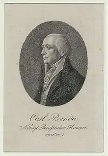 As a violin virtuoso, especially in his performance of adagios, Karl Benda closely resembled his father.[4] They were also said to be similar in character, stature and physiognomy.[5] He was also a prized piano teacher; among his students were King Friedrich Wilhelm III as well as his brother Ludwig, who gave him a lifelong patronage. Other students of Karl Benda were Carl Friedrich Rungenhagen, the actor and singer Friedrich Ludwig Seidel and the singer Luise Rudorff, whom he saw performing in the Weimarer Hoftheater in 1792,[6] when he was visiting his sisters Wilhelmine and Maria Carolina.[7] Karl Benda was also accompanist at the Royal Opera in Berlin. In 1802, he became successor to his deceased uncle Joseph Benda, who was a concertmaster at the Hofkapelle in Berlin.