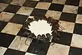 One day, Lakshman drowned in a Kapil Sarovar in nearby Kolayat while bathing. Her younger sister pleaded to Karni Mata to bring Lakshman back to life. Thus, Karni Mata lifted the body with her hands and brought it to where the murti (inner sanctum) is now, closed the doors, and said not to open them. She went to the god of death, Yamraj and demanded for Lakshman to be returned to life. The god of death queried, "if so, how will the cycle of rebirth work? By what law will it move?" Karni Mata thus declared that her family will not come to Yamraj anymore. "Wherever I live, they will live. When they die, they will stay with me."[2][3]