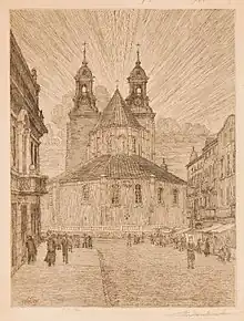 At the school, Karol set up a vocational school for printers.[3] Furthermore, he accepted a commissioning of the City Council for making etchings of views of Bydgoszcz: hence he documented the municipal architecture with around 100 engravings.