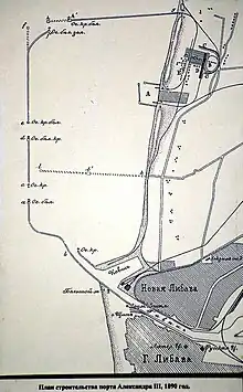 The naval base was originally constructed in 1890-1906 for Tsar Alexander III of Russia, and named Порт Императора Александра III.[1] Built on the bare coast it consisted of a large man-made harbour including a large breakwater and inland submarine base.