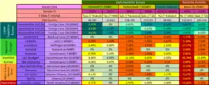 Ancestral Component (AC)Neolithic Anatolia/Southeast Europe: 70.56%, Caucasus Hunter / Early European Farmer: 19.86%, Scandinavian / West European Hunter: 9.34%, Paleolithic Levant (Natufians): 0.24%Neolithic Anatolia/Southeast Europe: 56.23%, Paleolithic Levant (Natufians): 16.56%, Caucasus Hunter / Early European Farmer: 14.19%, Scandinavian / West European Hunter: 9.64%, Neolithic Iran: 2.54%
