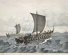 Karves (or Karvi) were a small type of longship with broad hull, somewhat similar to the ocean-going knarr cargo ships.[1] Karves were used for both war and ordinary transport, carrying people, goods or livestock. Because they were able to navigate in very shallow water, they were also used for coasting. Karves had broad beams of approximately 5 m (17 feet), were up to 21 m (70 feet) in length, and allowed for up to 16 oars.[2]