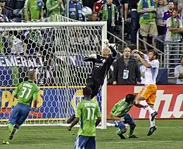 On August 14, 2008, Keller returned to the United States to sign with 2009 MLS expansion team Seattle Sounders FC.[12] He was the starting goalkeeper for the MLS team's first-ever match, on March 19, 2009, which the Sounders won 3–0. He continued to have a clean sheet in each of his next three starts, with a score of 2–0 per start. He also set the record for most minutes without a goal to start a season in MLS history. His clean sheet streak came to an end on May 2, 2009, at 457 minutes in the second half of a game against the Chicago Fire.[13] Keller played his final regular season home game for the Sounders on October 15, 2011, a game in which the Sounders beat the San Jose Earthquakes 2–1, with goals from Sammy Ochoa and Fredy Montero to send Keller out in style. A record crowd of 64,140 people were present.