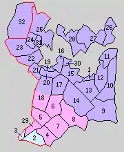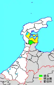 * yellow - areas formerly within the district borders during the early Meiji period