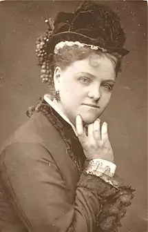 Bishop's most famous stage role was Violet Melrose in H. J. Byron's comedy Our Boys at the Vaudeville Theatre, which she originated in January 1875 and played practically continuously throughout its historic run of four years and four months.[2] When Our Boys finally closed, it was by far the longest-running work of theatre up to that time.[15] Byron supplied a successor, The Girls, in which Bishop had another leading role in 1879.[16] The next year, at the Vaudeville, she played Lady Teazle in the The School for Scandal for another long run, followed by Lady Alice in Dion Boucicault's Old Heads and Young Hearts in 1881. Later that year, she was Dora in T. W. Robertson's Home, an adaptation of Émile Augier's comedy L'Aventurière.[6] After this, Bishop moved to Australia to head a company produced by Arthur Garner, playing comedies, including The English Rose. The next season, she moved on to George Rignold's company, as leading lady, in a variety of dramas and comedies, where she stayed for several years, earning strong reviews.[1] In the late 1880s she married and left the stage for more than a decade at the end of the nineteenth century.[2] While there, she taught elocution.[6]
