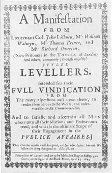 By this time she had emerged as a leader of Leveller women and seems to have been involved in their petitioning of Parliament. On 29 April 1649 the English Council of State committed to prison the Leveller leaders John Lilburne, Richard Overton, William Walwyn and Thomas Prince, who owned a book critical of the regime, England's New Chains.[68] The House of Commons agreed that they should be tried under Common Law on 11 April.[69] The House was under a constant bombardment of petitions on behalf of the arrested Levellers, and women mobilised in numbers. On 23 April Bulstrode Whitelocke observed: