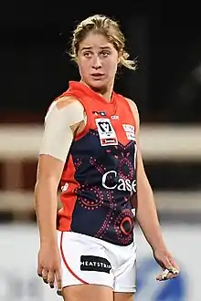 Katherine Smith (born 28 September 1998) is an Australian rules footballer playing for Greater Western Sydney in the AFL Women's competition. She was drafted by Melbourne with their seventh selection and 56th overall in the 2016 AFL Women's draft.[1] She made her debut in the 15-point loss to Brisbane at Casey Fields in the opening round of the 2017 season.[2] After the two-point win against Adelaide at TIO Stadium in Round 6—in which she recorded ten disposals and a mark—she was the round nominee for the AFLW Rising Star.[3] She played every match in her debut season to finish with seven games.[4]