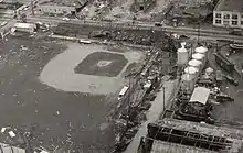 • In May 1953, a tornado came through Waco and destroyed most of Katy Park. During the natural disaster, then-General Manager Buster Chatham of the Waco Pirates, who had complained about the trains that went by the park's west side, found refuge in large engine car; he never had a problem with the trains after the tornado. Also, In the aftermath of the tornado, the Pirates moved to Longview to become the Cherokees for the rest of the season, then returned the next season at Katy Park. A game scheduled for May 12, 1953, between TCU and Baylor was canceled.[7] For a while, a Texas "colored" championship had taken place at Katy Park as well, but that year's game was moved to Fort Worth due to the devastation of the ballpark.