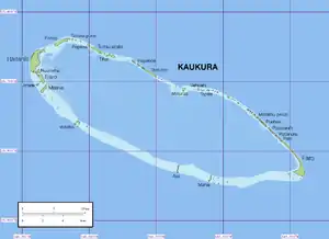 Kaukura or Kaheko[2] is an atoll in the Tuamotu group in French Polynesia, 48 km (30 mi) long and 15 km (9 mi) wide. It is in the western area of the archipelago, 58 km (36 mi) southeast of Rangiroa. The closest land is Apataki Atoll, 24 km (15 mi) to the northeast.