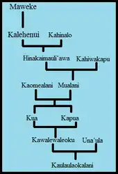 After his father's death, Kaulaulaokalani ruled over Koʻolau. During his time, over other parts of Oʻahu ruled High Chief Lakona and High Chiefess Maelo of Kona. Wife of Kaulaulaokalani was called Kalua-i-Olowalu;[4] her parents are not known today. She and Kaulaulaokalani were the parents of the High Chiefess Kaimihauoku of Koʻolau, who was her father's successor. Kaimihauoku married a man named Loe, whose genealogy is unknown. Their son was Moku-o-Loe,[5] ruler of Koʻolau.[6]